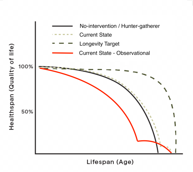 Longevity is summarised in this graph - as our life continues, we age, and with that, our health naturally deteriorates (the downward curve).